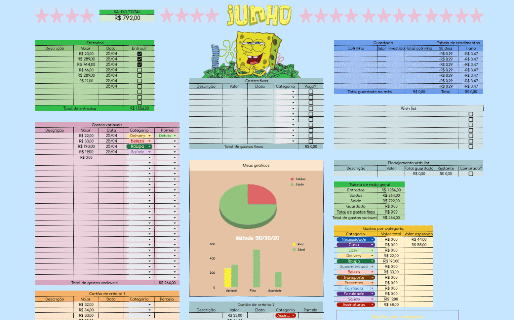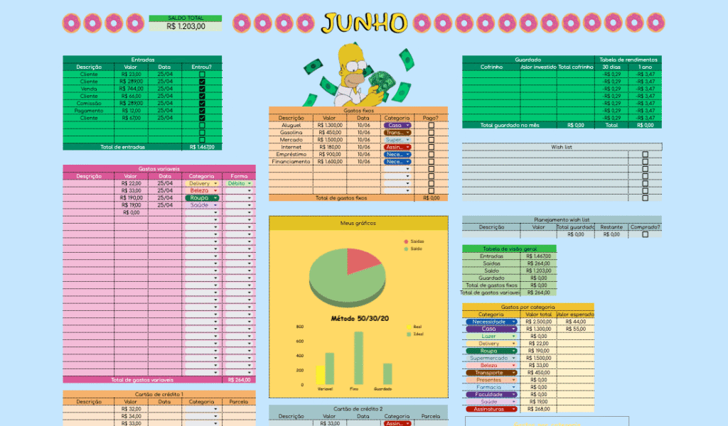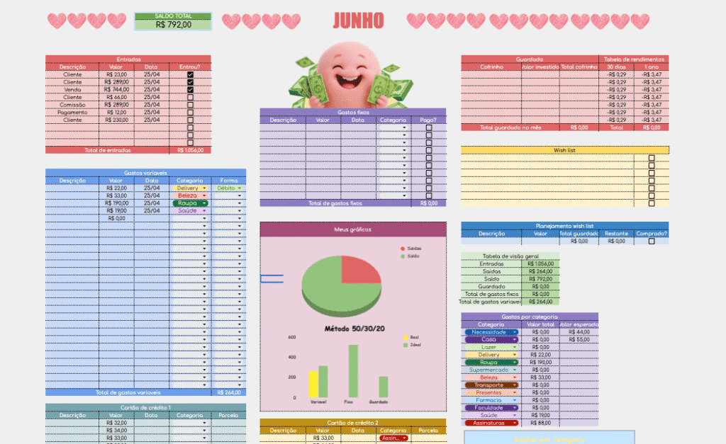Tudo já vem configurado pra você só preencher e acompanhar, e se quiser, pode personalizar do seu jeito conforme suas metas e objetivos.